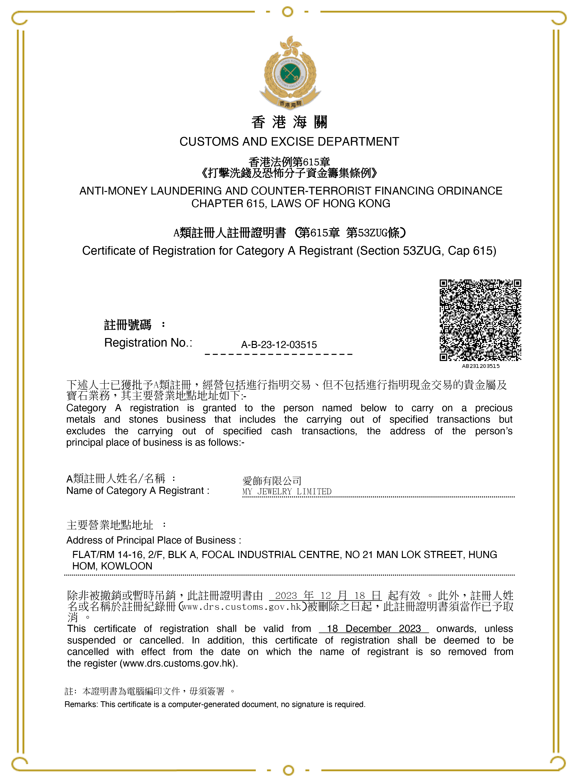 香港海關A類註冊人註冊證明書 / 註冊號碼:A-B-23-12-03515